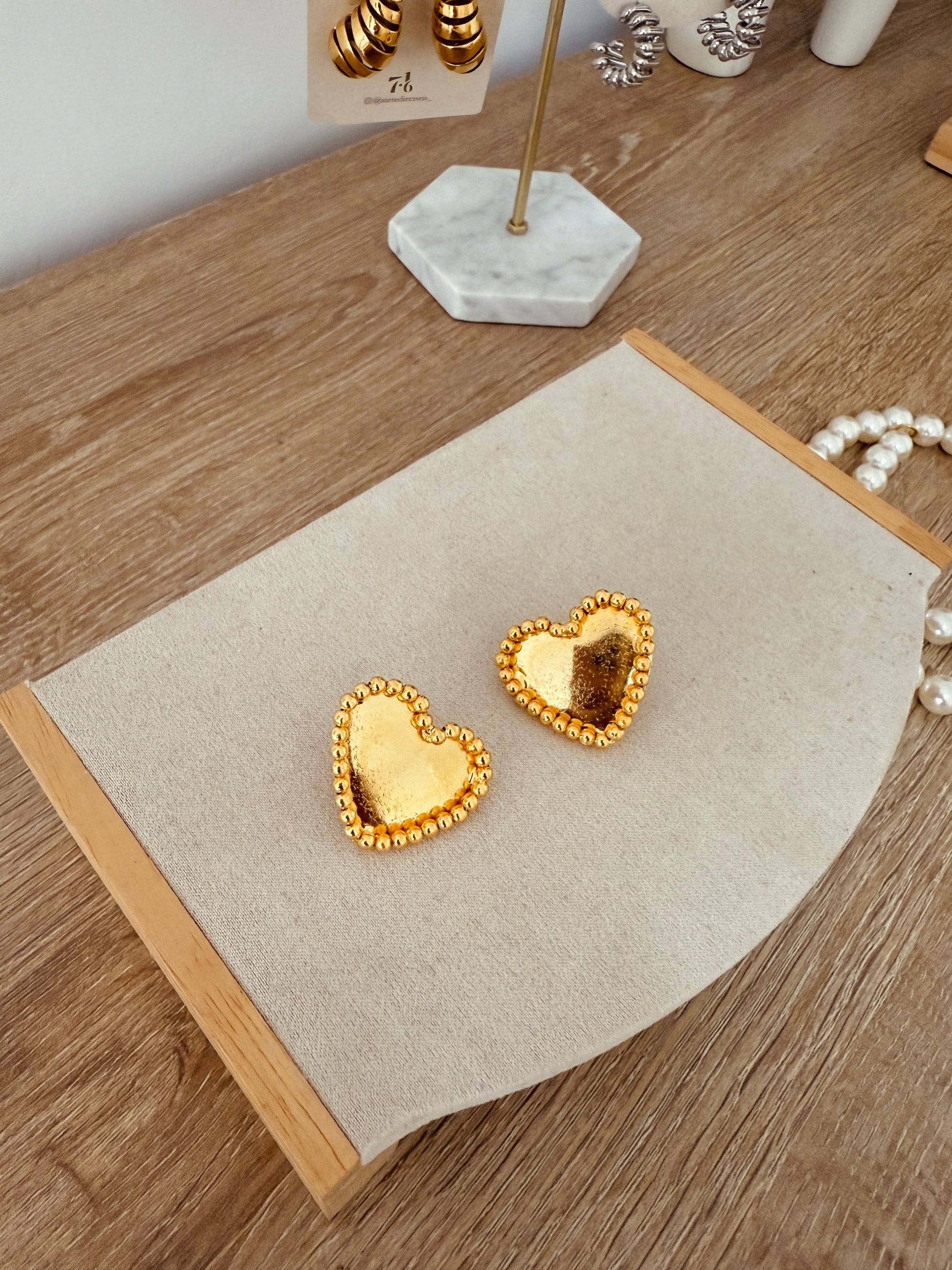 Corazones enlazados en sus bordes a mano, medianos, elaborados en bronce con baño en oro.