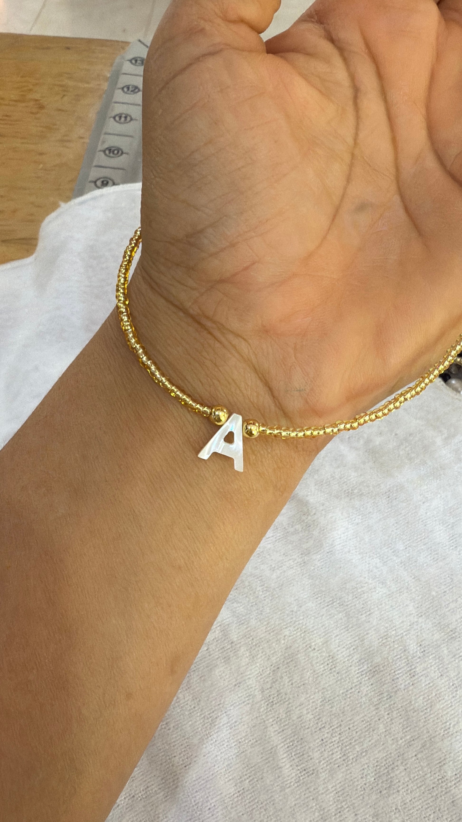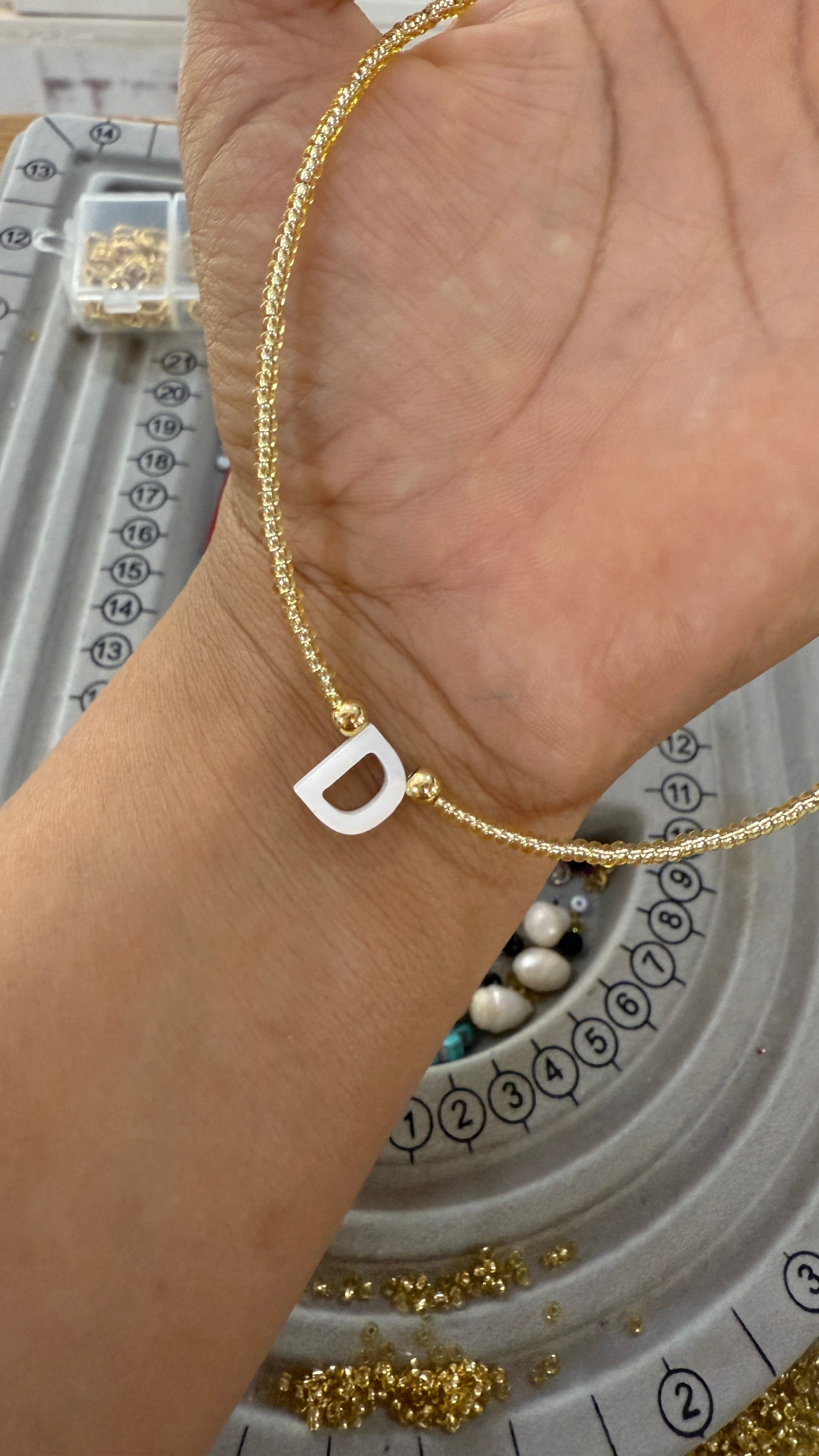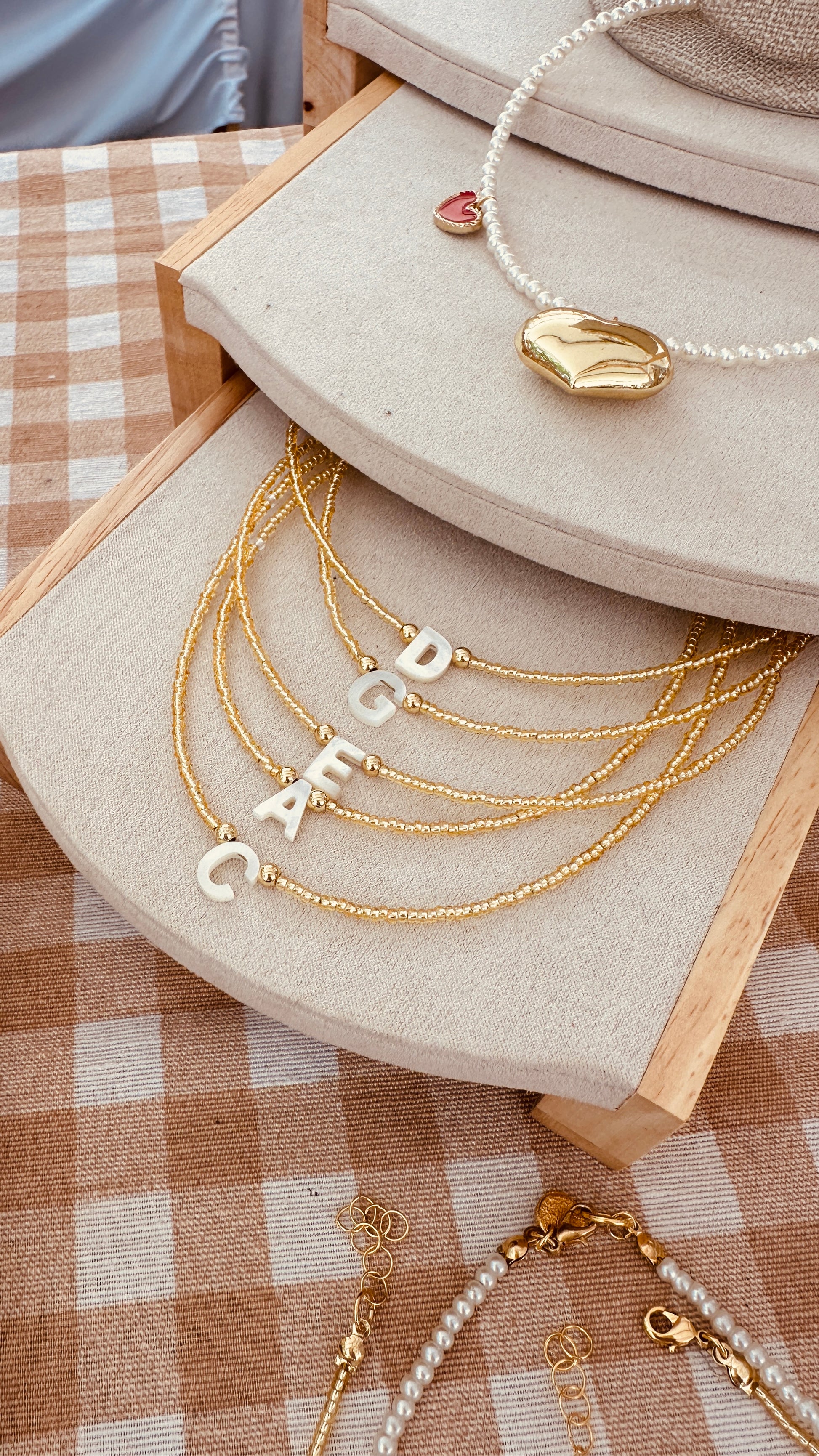 Collar en miyuki dorado con inicial en nacar al final del collar tiene una extensión para que ajustes el largo como mas te gusta; como gargantilla, a la altura de la clavícula o mas largo. Este collar esta realizado 100% a mano, se inserta manualmente cada cuenca hasta armar el collar.