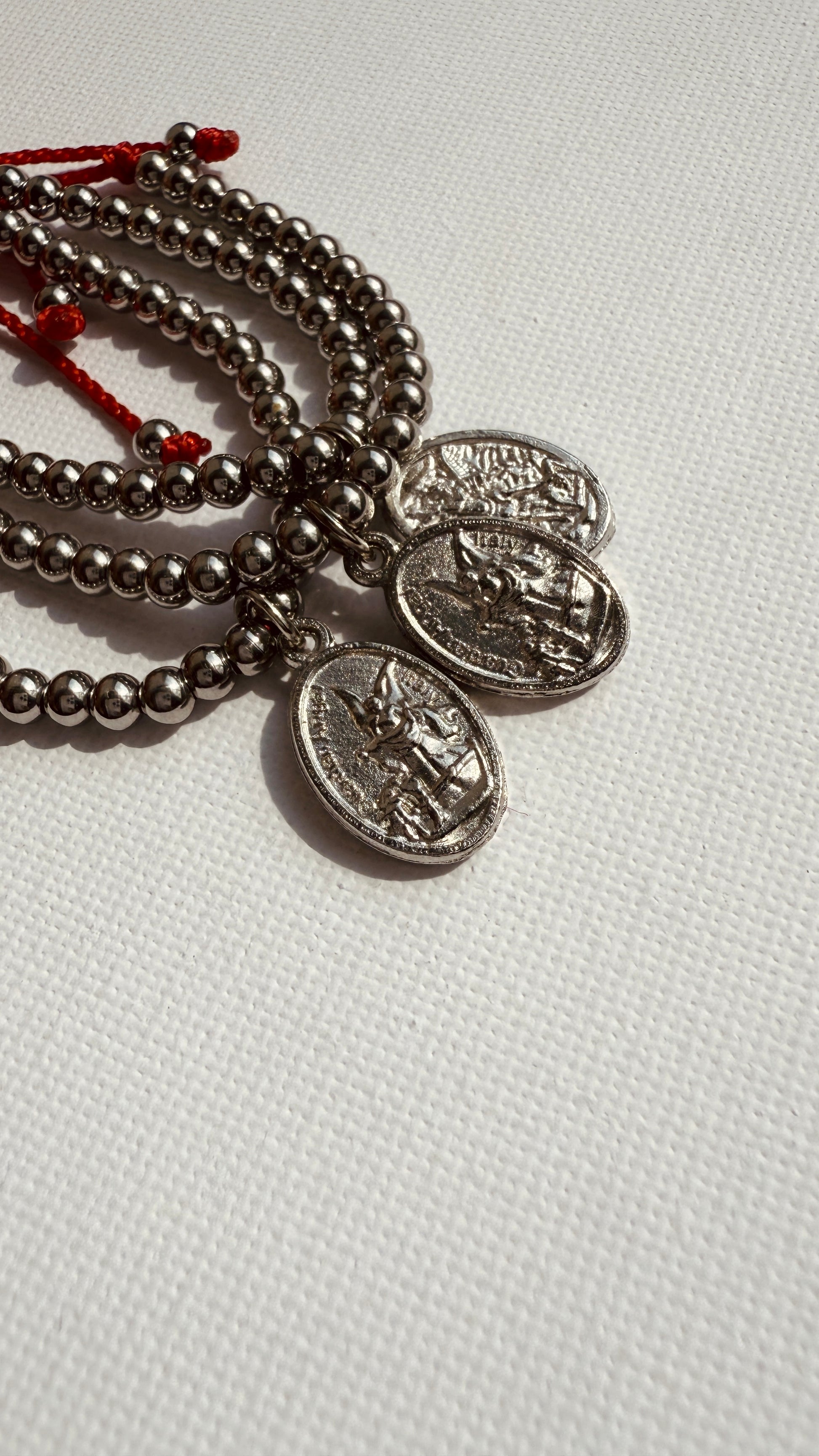Elaborada con balines y dije en acero, hilo rojo ajustable
