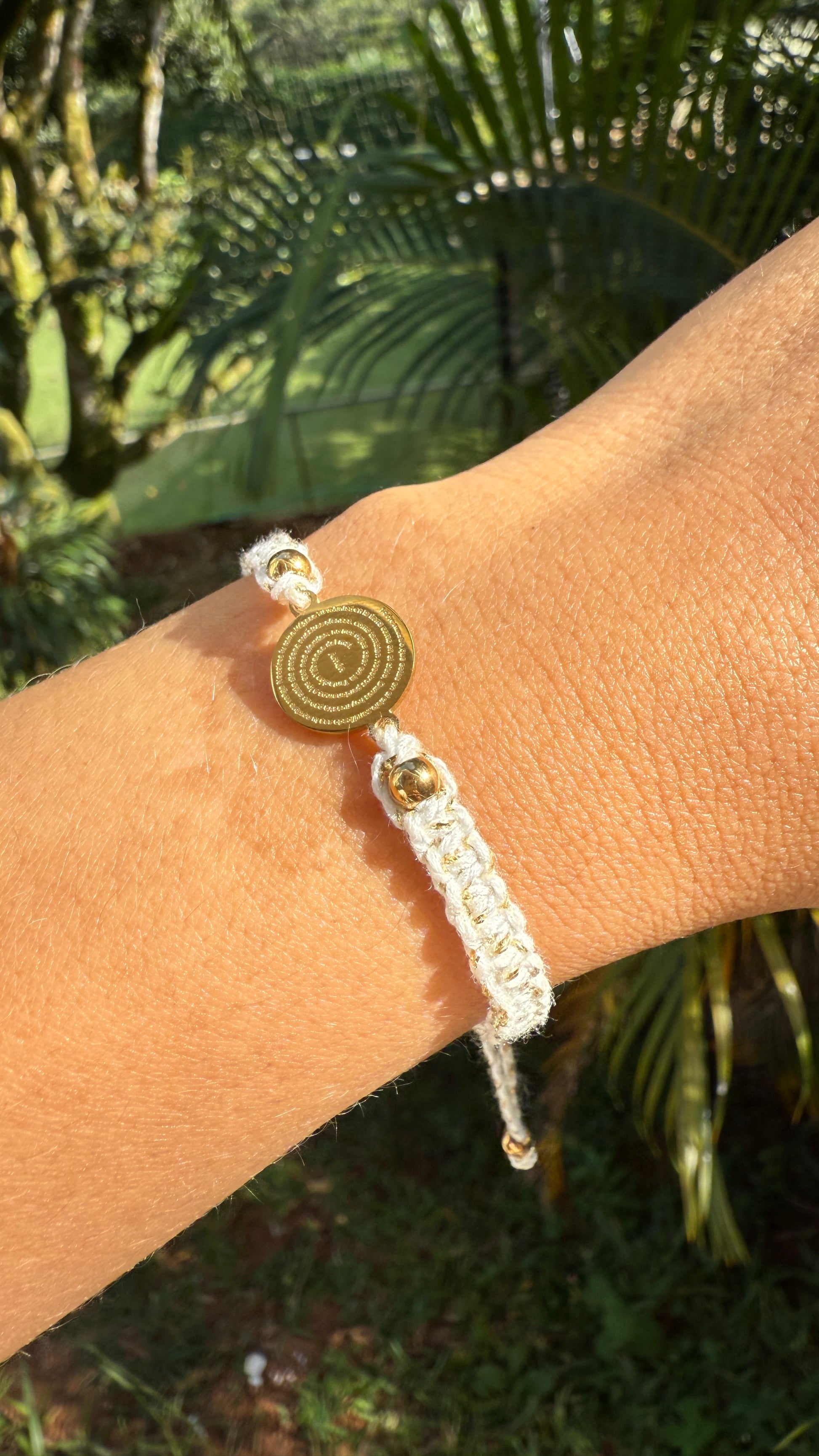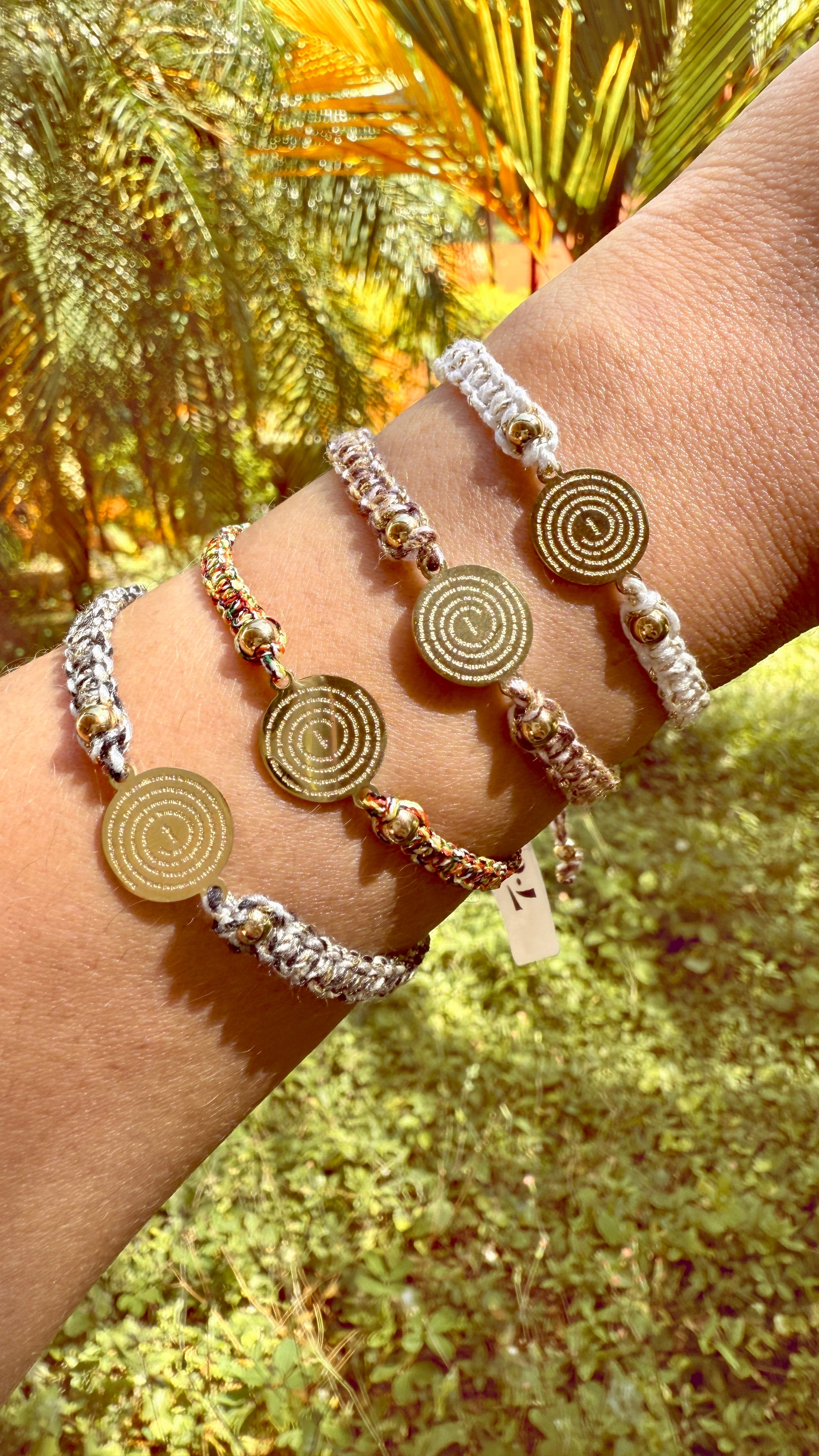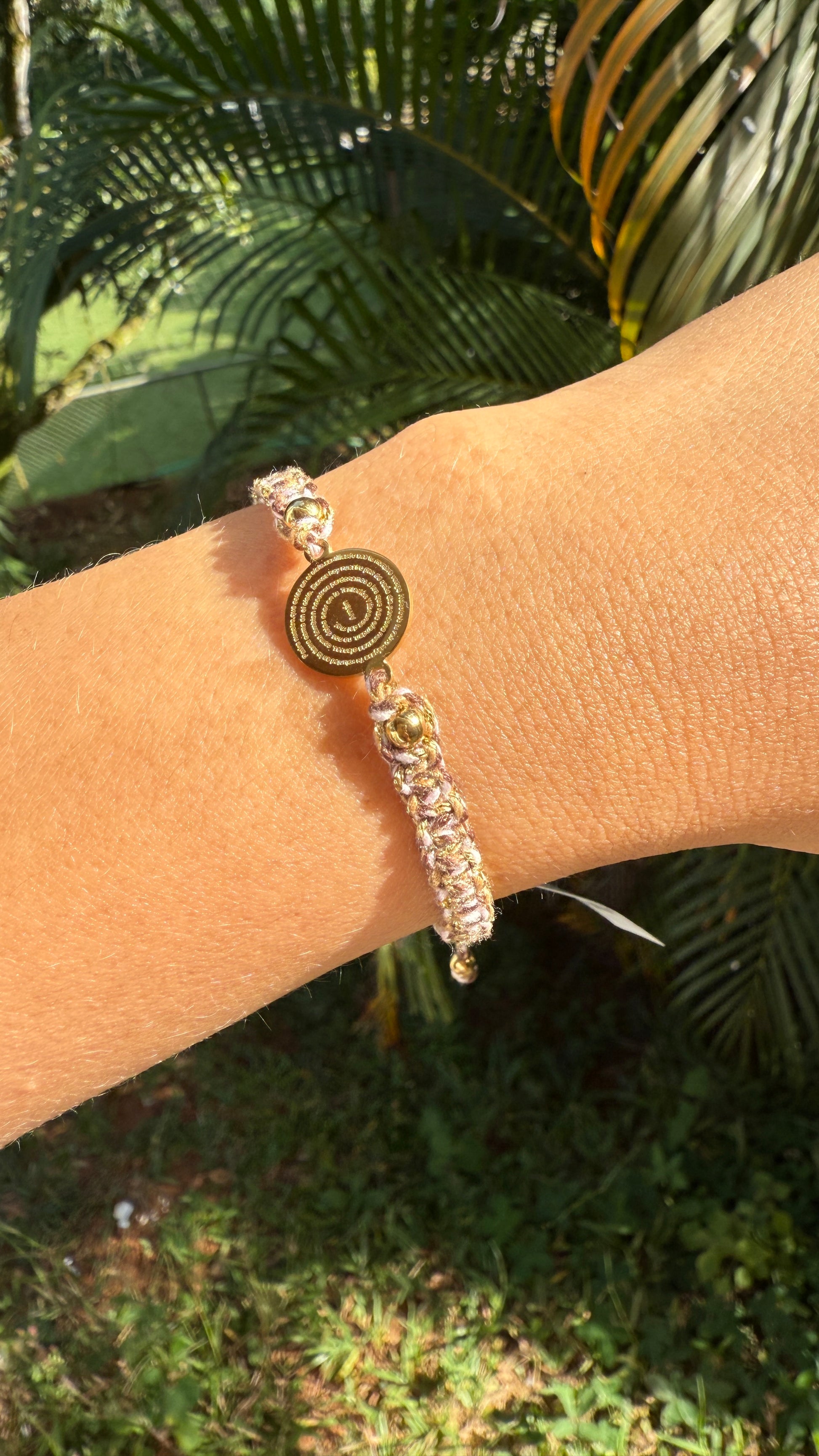 Oración del Padre Nuestro grabado en la placa, elaborada con hilos en tonos sutiles mezclados entre sí con visos dorados, logrando que cada manilla sea única.