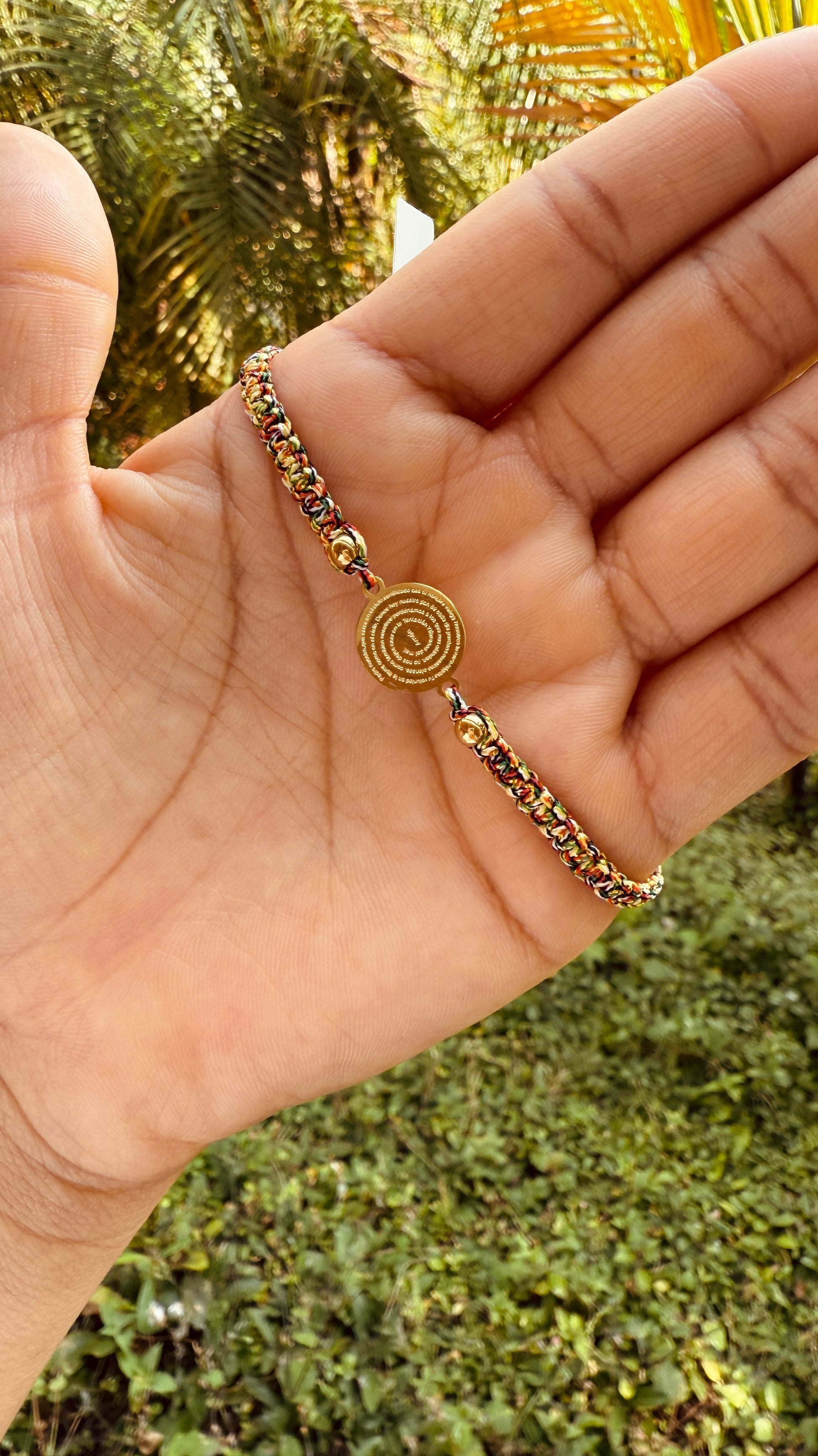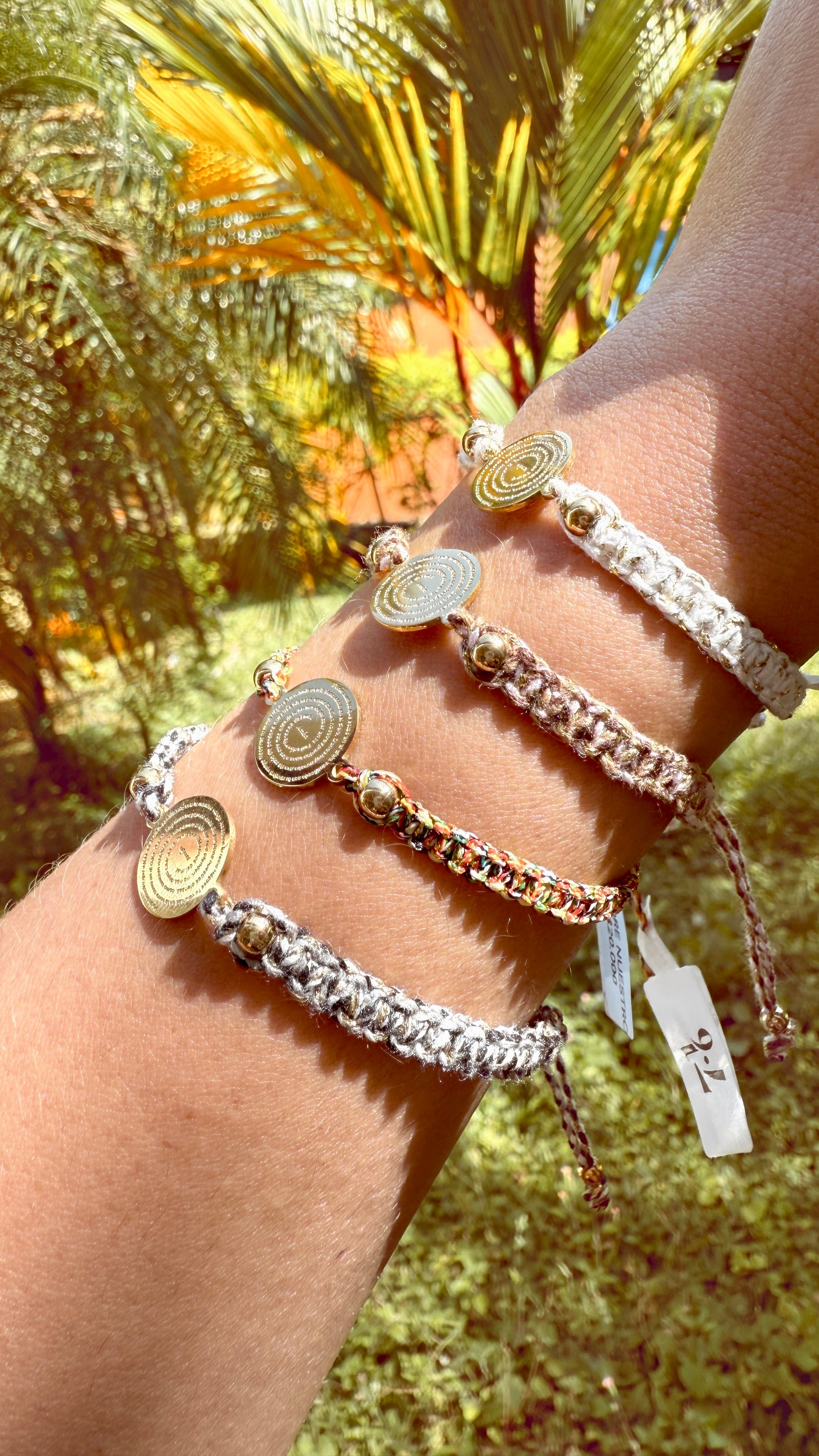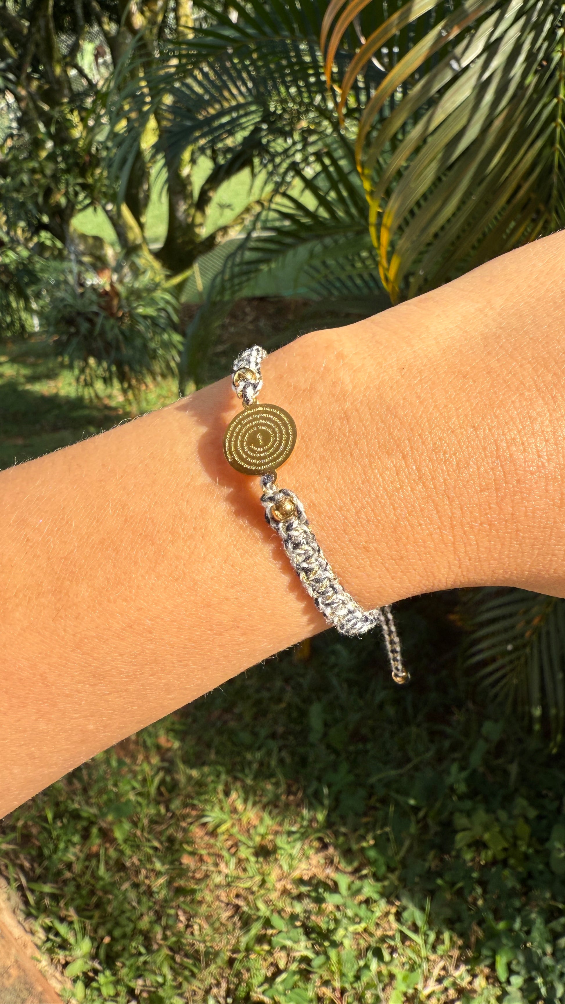 Oración del Padre Nuestro grabado en la placa, elaborada con hilos en tonos sutiles mezclados entre sí con visos dorados, logrando que cada manilla sea única.