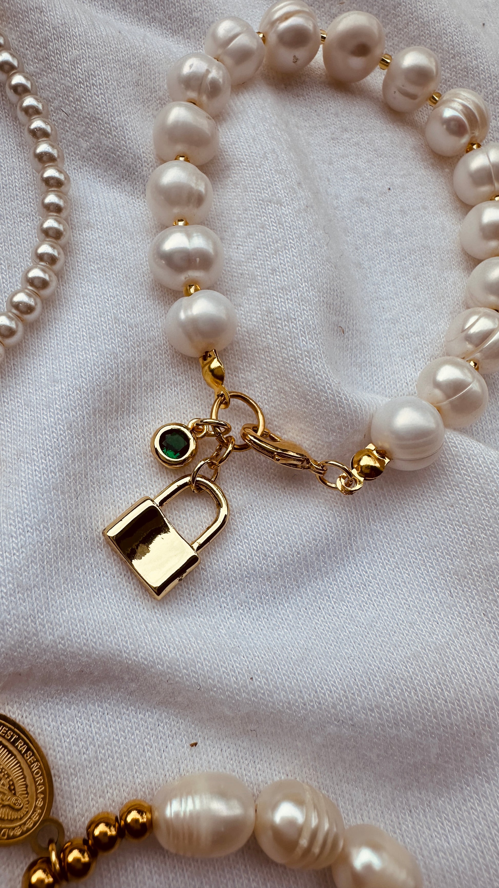 La elegancia y sofisticación en una pieza, elaborado con perlas de rio y dije en forma de candado.