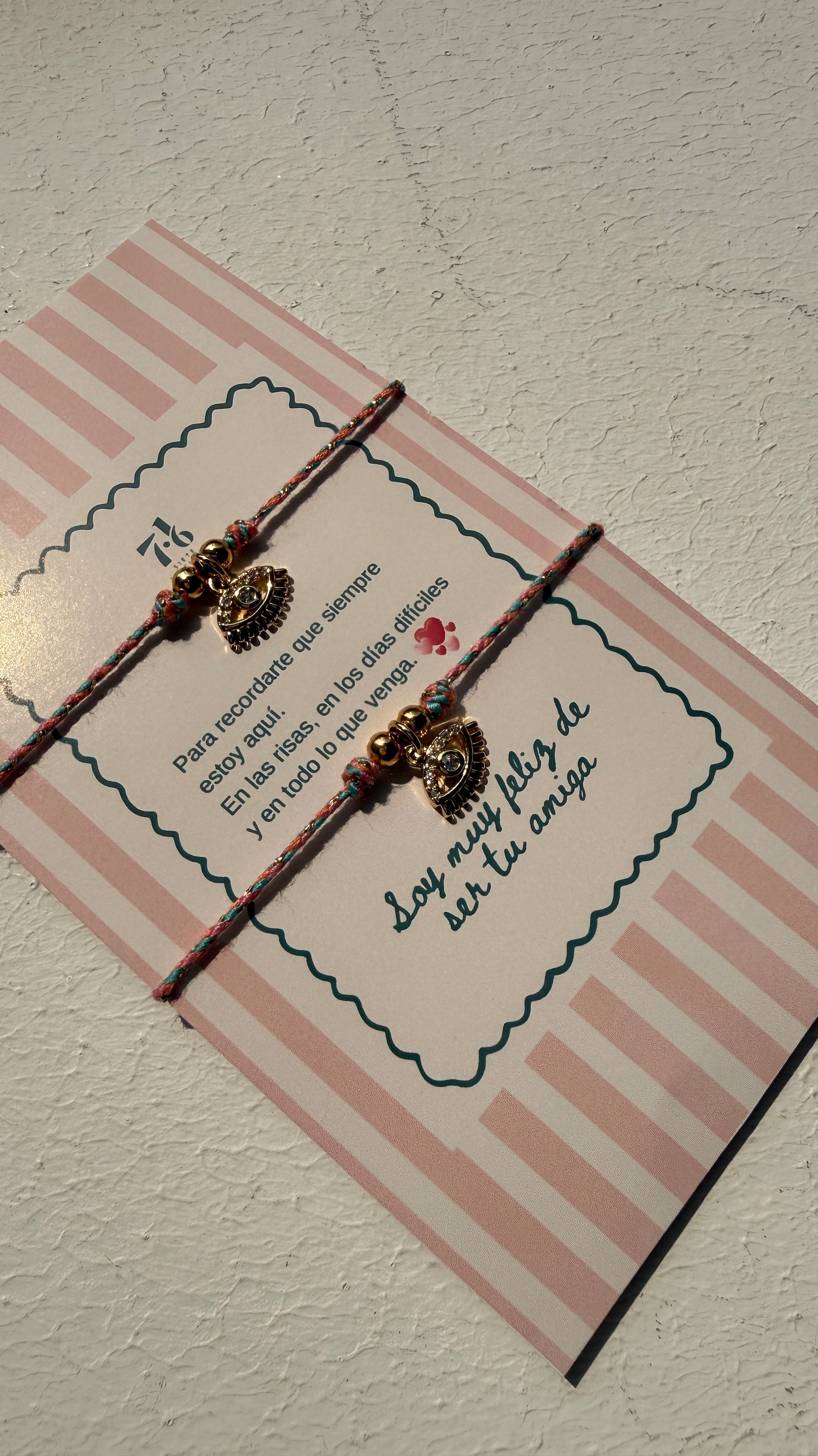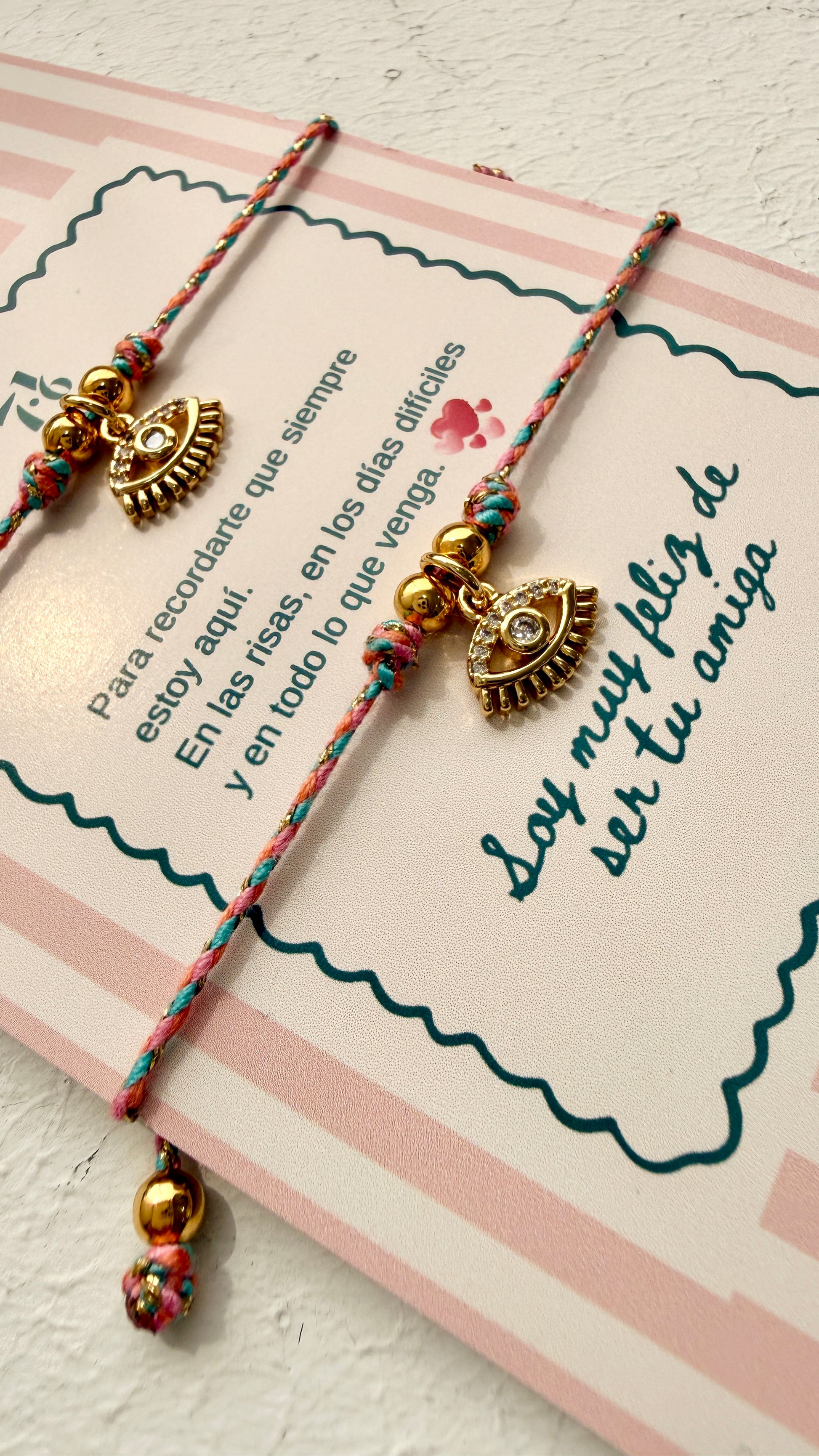 Dúo de manillas con hijo en dos tonalidades, dije en ojo con microcircones y tarjeta con mensaje predeterminado.