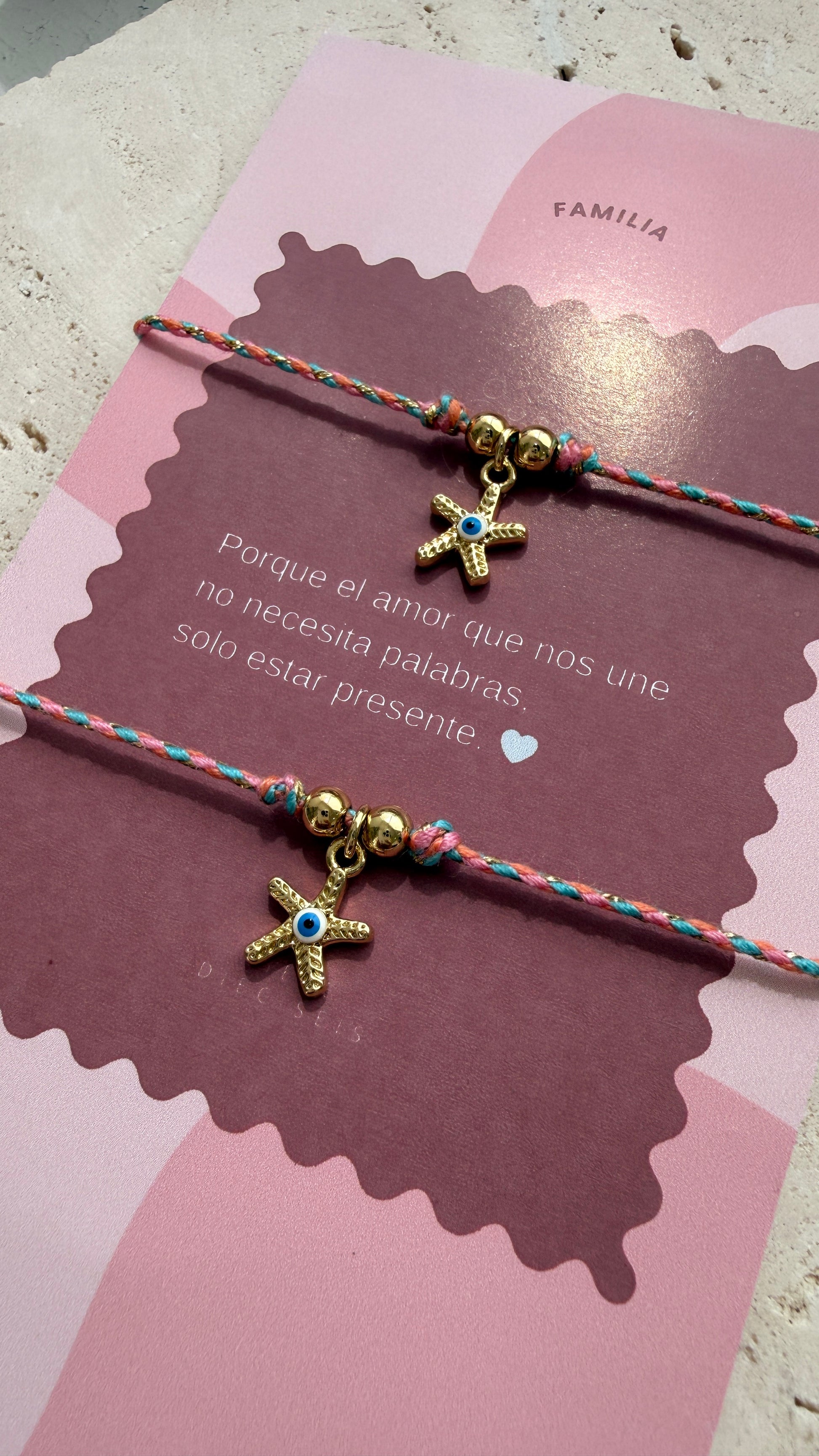 Tarjeta con mensaje impreso, dos manillas con dije de estrella