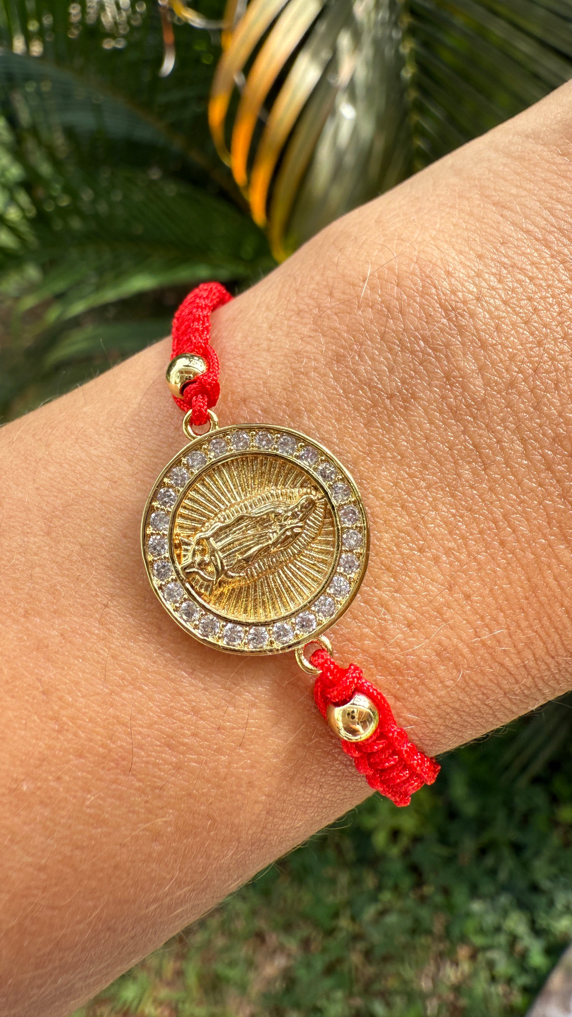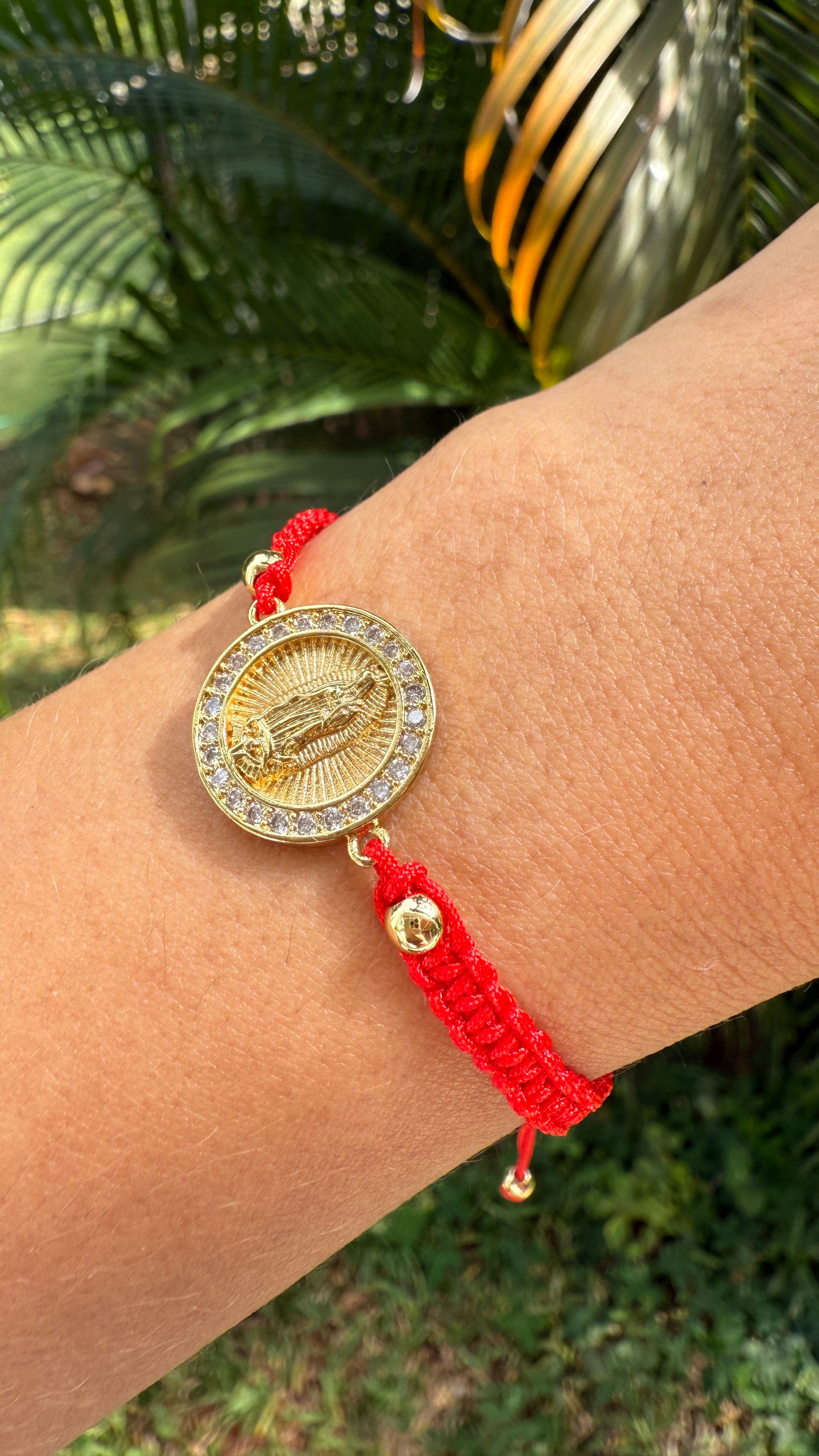Tejida en macrame, en el centro la virgen de guadalupe tallada con microcircones
